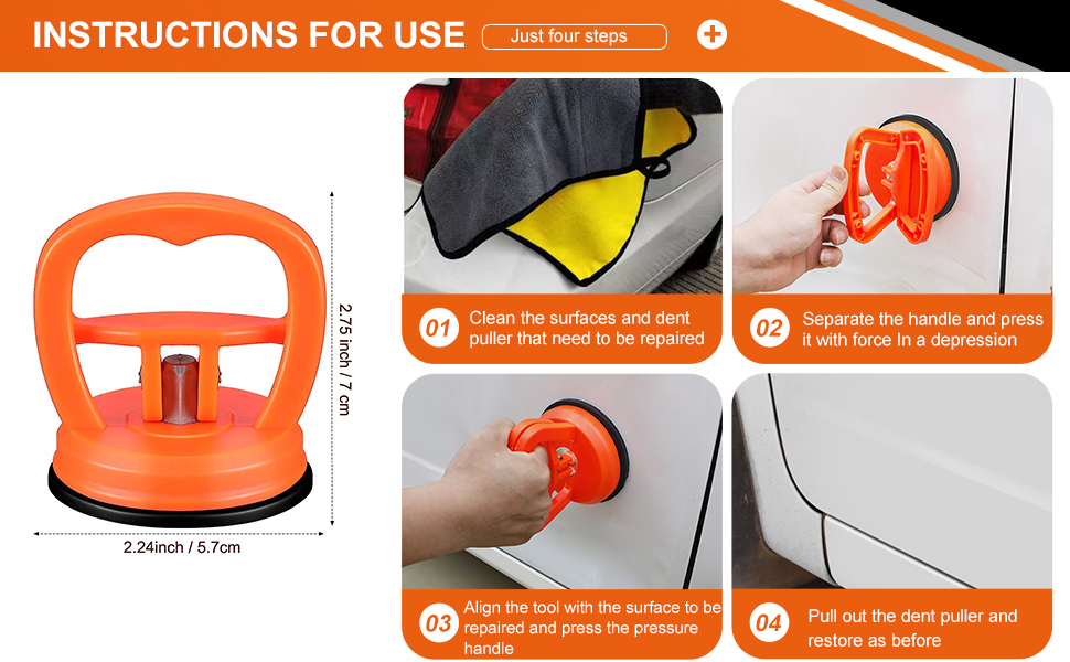 【Easy to Operate】First,clean the surface and let paintless dent repair kit dry. Next, heat the dent area and adjust the handle of the car dent remover to the detached position. Then, place the suction cup dent remover on the surface and push down on the air. Finally, quickly pull the double handle to the upward position, you can pull hard on the handle.